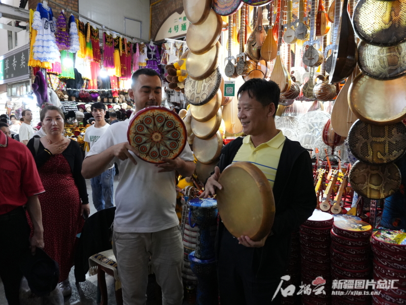 8月1日,台商台企参访团在新疆国际大巴扎景区体验手鼓。石榴云/新疆日报记者 闫啸天摄
