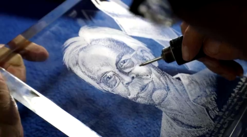 “西方的很多水晶肖像刻得是很不错的。然后我就在它的基础上,根据中国的特点,除了五官很立体的雕刻以外,像雕塑一样。我们后来发明了一个叫做点刻,是中国传统的技巧,就靠点线组合起来一个很美的像照片一样的肖像。”吴子熊玻璃艺术馆馆长、台州玻雕非遗传承人吴刚说。