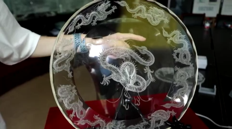 “这件九龙盘是要送去威尼斯进行展览的作品。传统造型的酒红盘,可能多数是用瓷器做成的,我用水晶来做这件作品,它让这整个龙的图案腾空而飞的感觉呈现出来。”在吴岳的雕琢下,这条龙栩栩如生的样子仿佛真的要从玻璃里飞出来一般。