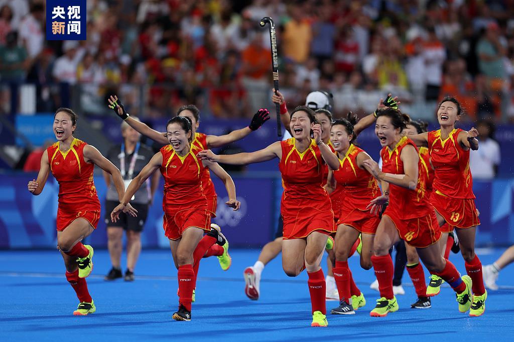 △巴黎奥运会曲棍球女子半决赛,中国队点球战胜比利时队,女曲姑娘们欢呼庆祝。