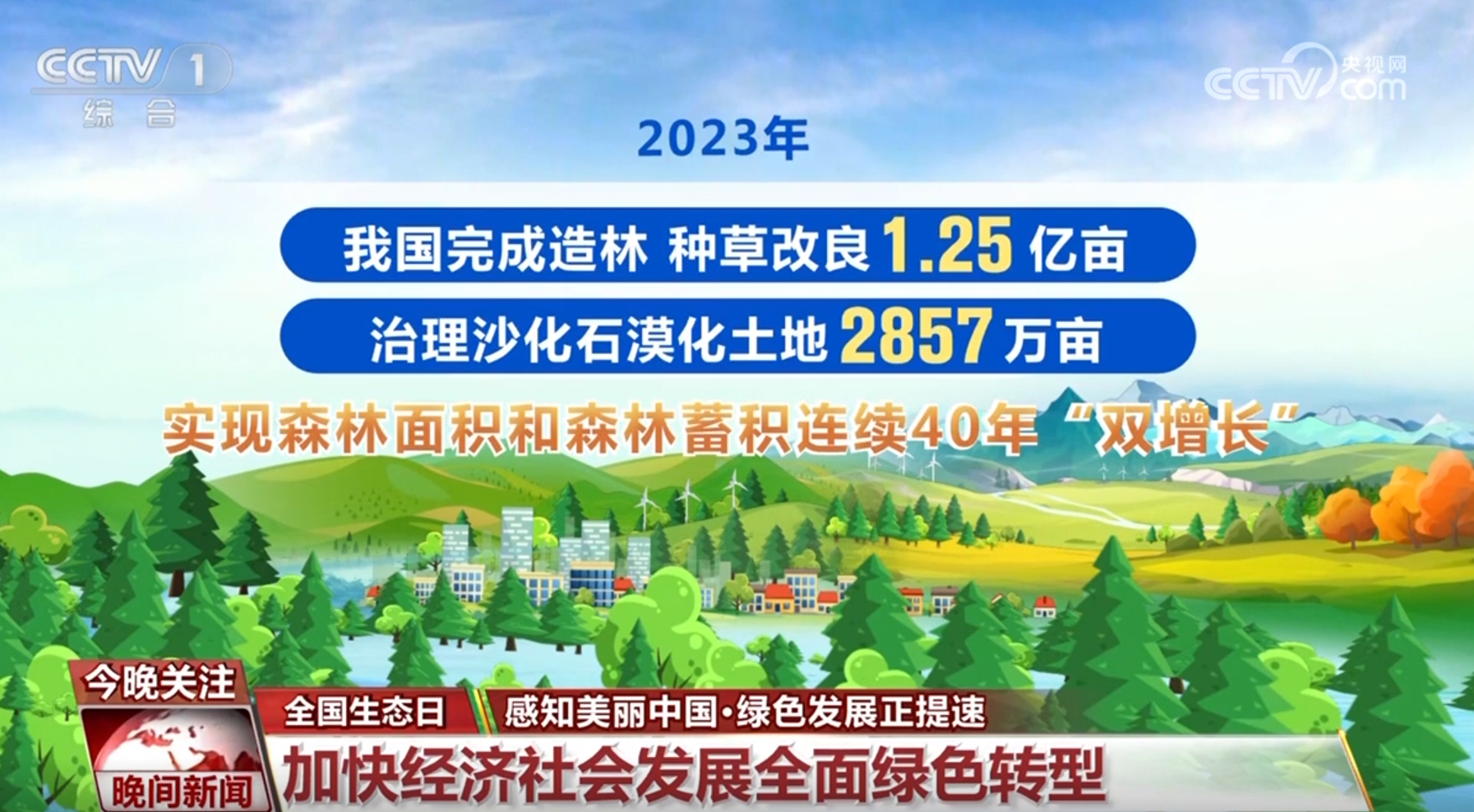 共护家园。2023年,我国完成造林、种草改良1.25亿亩,治理沙化石漠化土地2857万亩,实现森林面积和森林蓄积连续40年“双增长”。