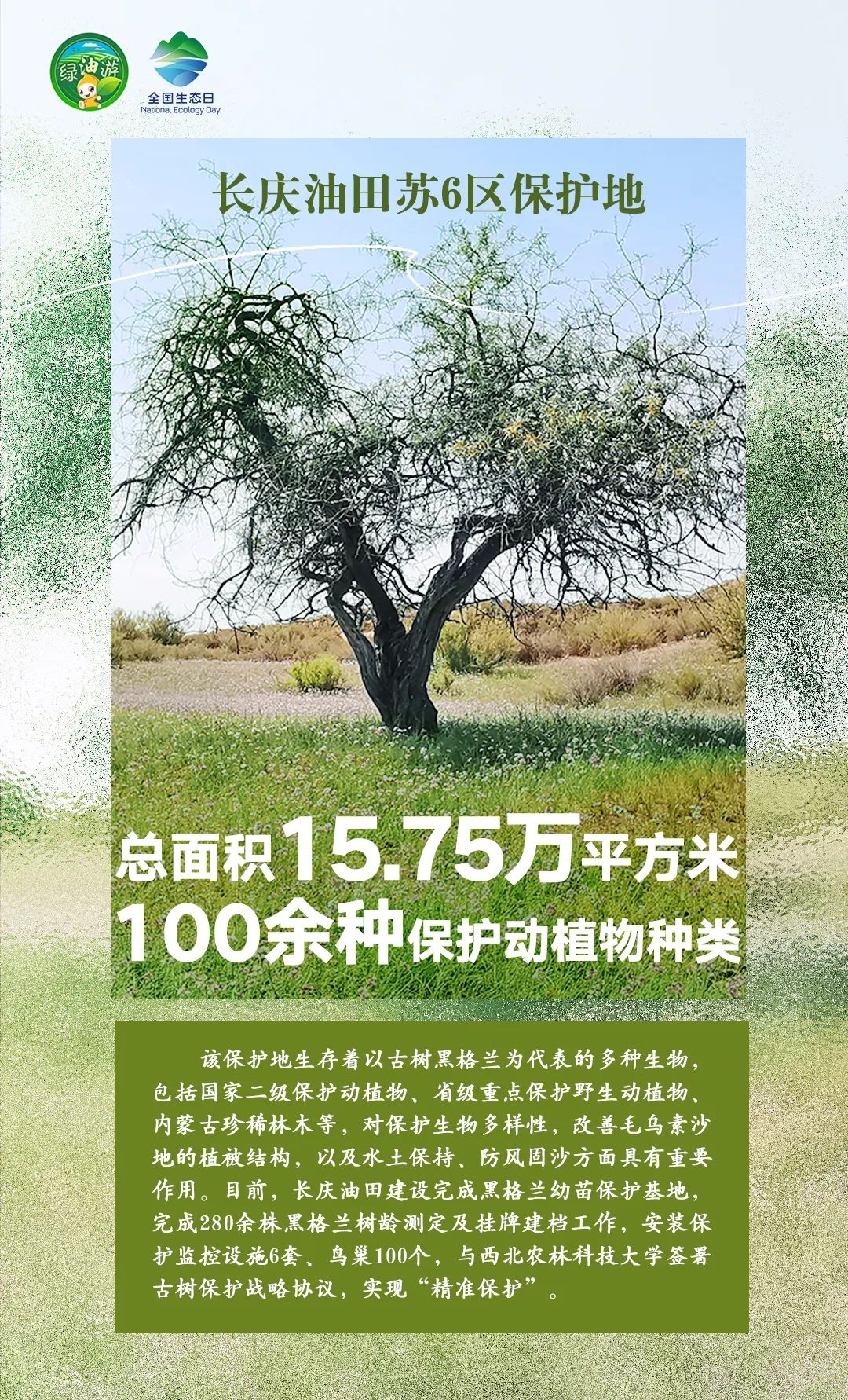 在长庆油田苏里格气田苏6区生物多样性保护地,采气工人在巡护井线的间歇维护古树“黑格兰” 张辉/摄