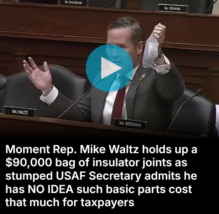 在今年4月举行的美国2025财年军费预算听证会上,美国佛罗里达州众议员迈克·沃尔兹曾就军费直接质询空军部长肯德尔。沃尔兹掏出一袋绝缘接头说,这一袋子没有太多技术含量的零件,在美国空军采购清单上的报价竟然高达9万美元。沃尔兹控诉,“五角大楼只从原始设备制造商那里购买商用零件,这正在让美国政府破产”!
