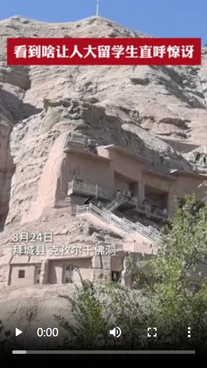 8月24日,参加“理解当代中国 感知开放新疆”研学之旅的中国人民大学留学生及港澳台学生走进阿克苏地区拜城县克孜尔千佛洞。来自泰国的中国人民大学留学生刘珍妮参观时沉浸其中,作为石窟和壁画的爱好者, 她几次发出感叹:“新疆把上千年历史的文化遗产保护得很好!”