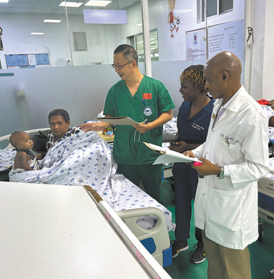 第二十七批中国援坦桑尼亚医疗队队员赵立健与坦方医务人员正在查房。