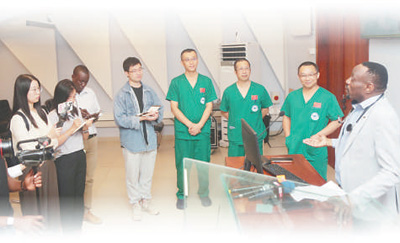 第二十七批中国援坦桑尼亚医疗队队员和当地医生向中坦媒体记者介绍相关情况。
