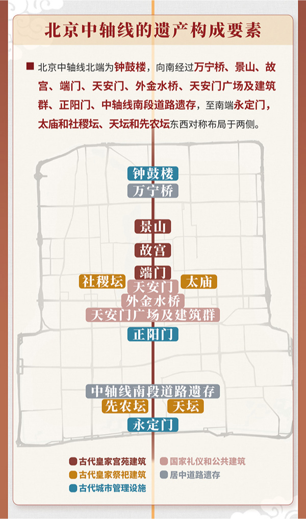 在不同历史阶段的城市发展中,北京中轴线整体的规划格局与景观秩序均得到尊重与延续,展现出持久的生命力,同时又在时代需求的驱动下得到不断发展与传承,见证了中华文明的伟大成就,展现出中国传统都城中轴线规划理念对于城市发展的深远影响。