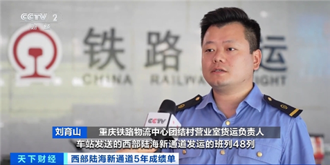 重庆铁路物流中心团结村营业室货运负责人 刘育山:今年六七月份车站发送的西部陆海新通道发运的班列48列,较去年同期增长60%。这部分班列超过80%通过铁海联运的方式发往世界各地。