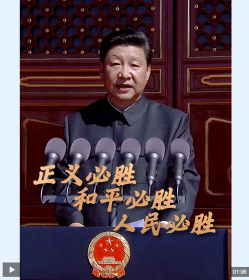 2015年9月3日,在纪念中国人民抗日战争暨世界反法西斯战争胜利70周年大会上,习近平主席 “三个必胜”振聋发聩,道出了中国人民的心声,也承载着世界人民的愿望。