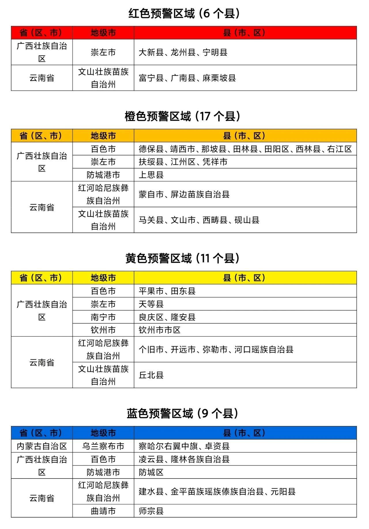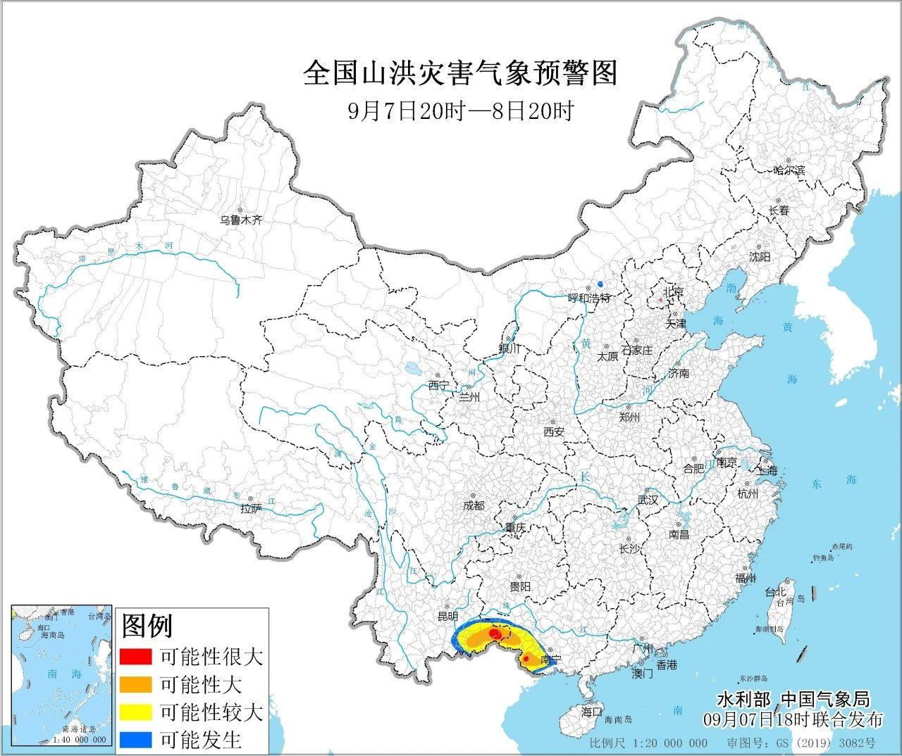 预计,9月7日20时至9月8日20时,广西西部和西南部、云南东部等地部分地区发生山洪灾害可能性大(橙色预警),其中,广西西南部、云南东部局地发生山洪灾害可能性很大(红色预警)。其他地区也可能因局地短历时强降水引发山洪灾害,请各地注意做好实时监测、防汛预警和转移避险等防范工作。