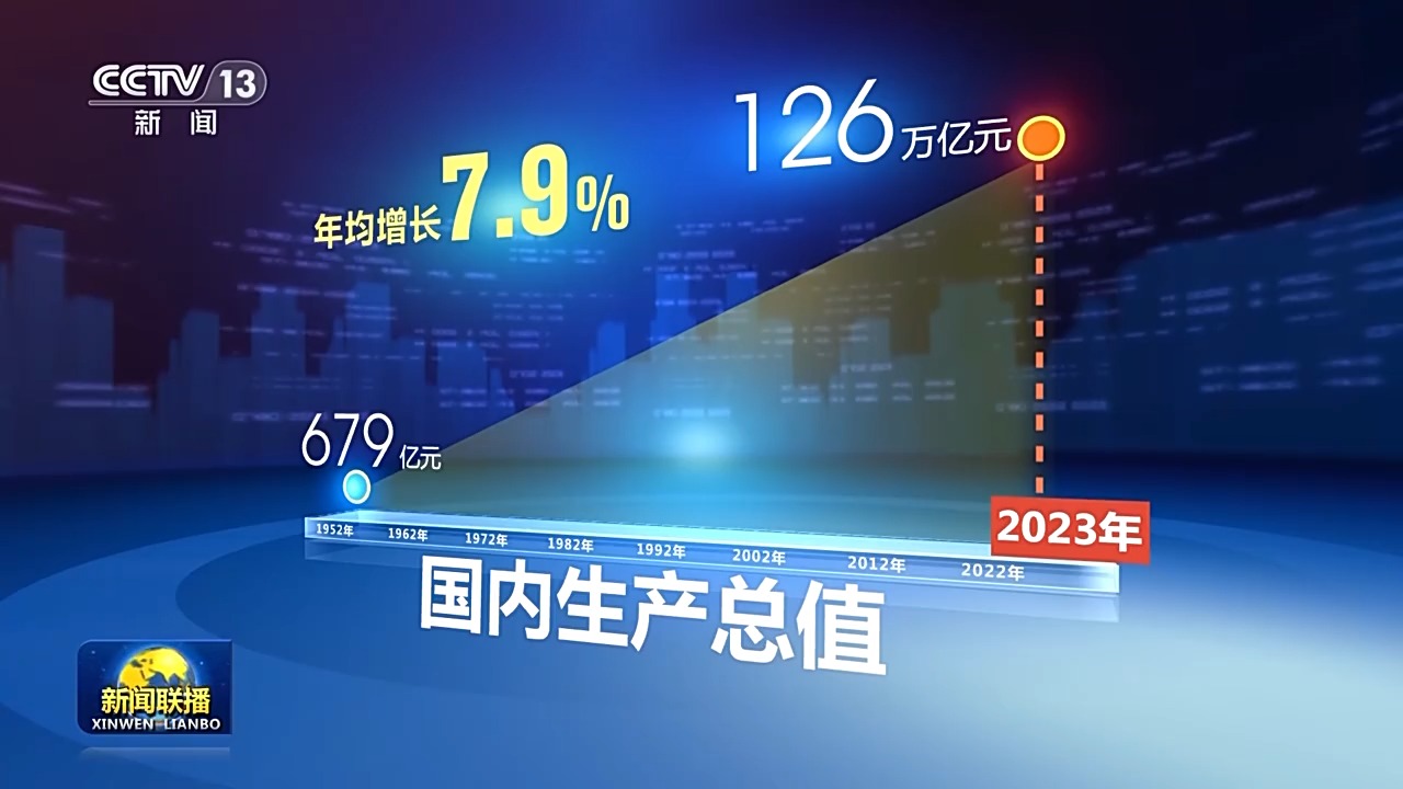 我国国内生产总值,从有数据统计以来的1952年的679亿元,增长到2023年的126万亿元,年均增长7.9%。
