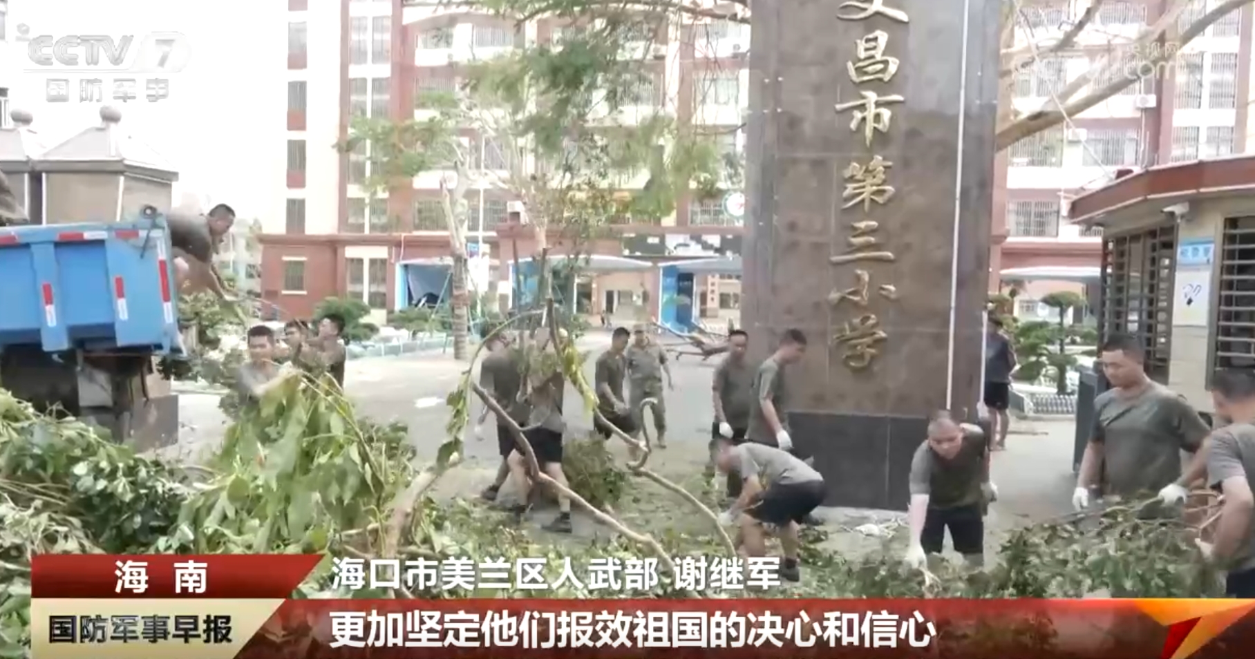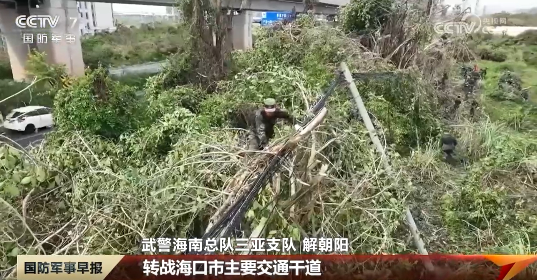 武警海南总队出动2500多名官兵,投入车辆、挖掘机等各类装备,担负海口市主要街区道路疏通、垃圾清运和抢修通信光缆等任务,确保当地群众早日恢复正常生产生活。