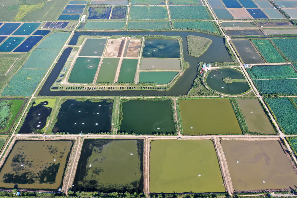 2024年8月13日在山西省临猗县薛公村拍摄的蟹塘(无人机照片)。薛公村位于黄河岸边,有5000多亩黄河滩涂和近5000亩荒沟。当地通过将荒沟和滩涂进行整合,发展特色水产养殖,让守着黄河水、住在黄河滩的薛公村村民有了新的致富路。