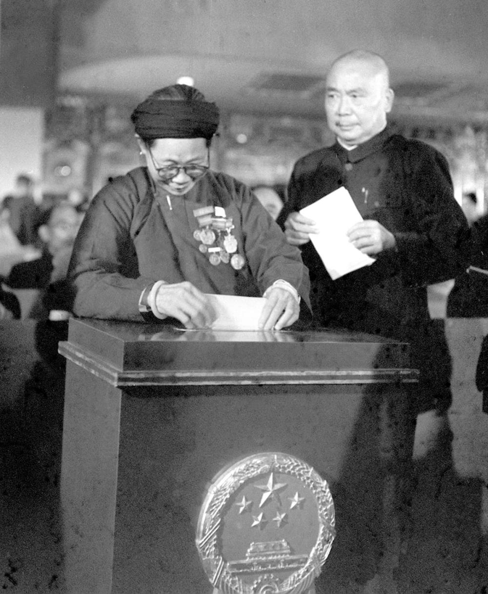 这是全国人大代表、中国人民志愿军黄继光烈士的母亲邓芳芝在投票。