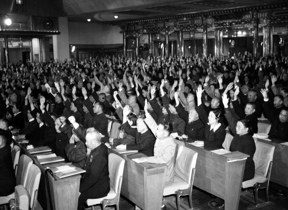 1954年9月26日,全体代表一致举手通过《关于政府工作报告的决议》。
