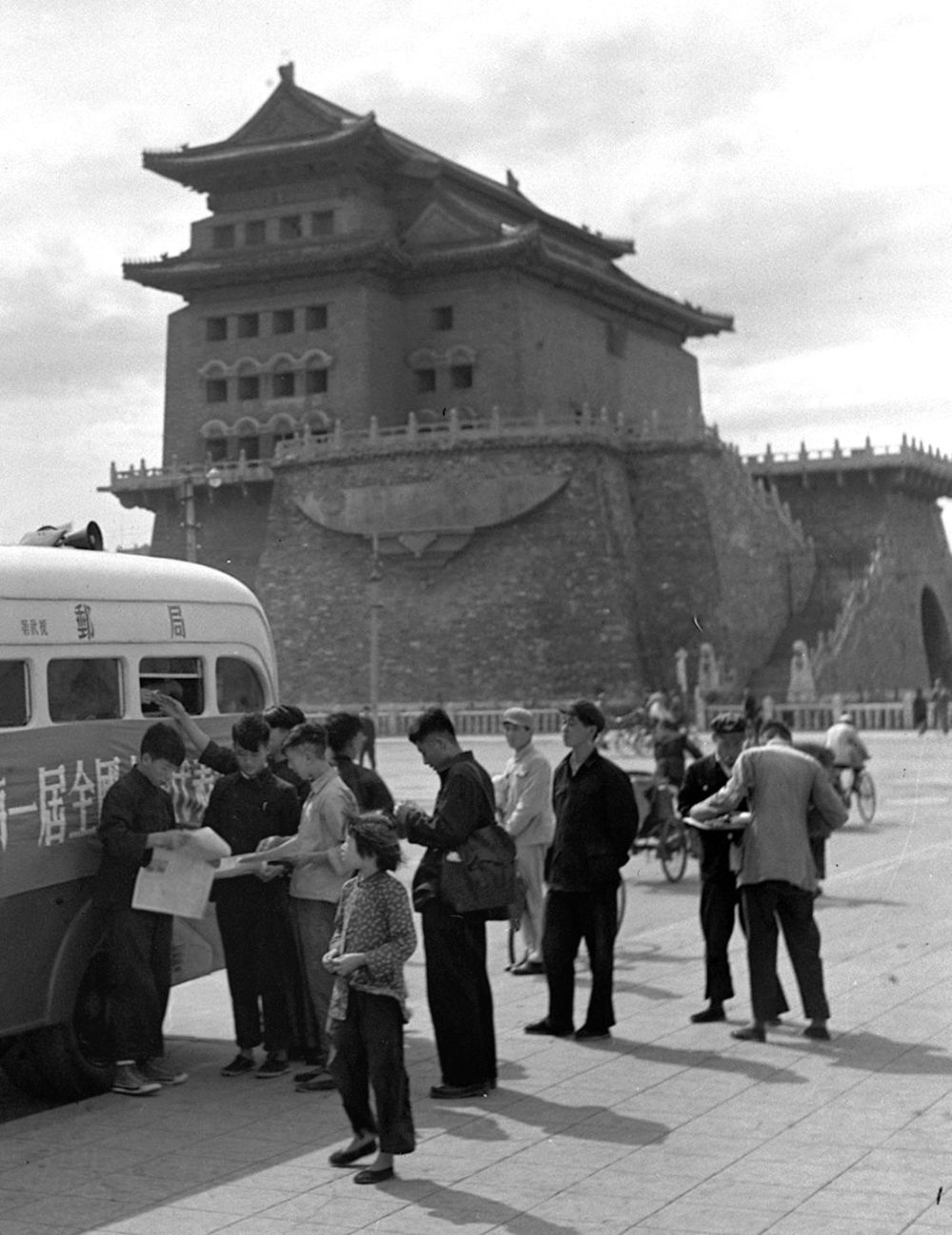 1954年9月15日至28日,第一届全国人民代表大会第一次会议在北京召开。北京邮局为了及时把刊载着会议消息的报纸送到读者手里,出动邮车在街头售卖报纸。这是市民们购买报纸的情形。