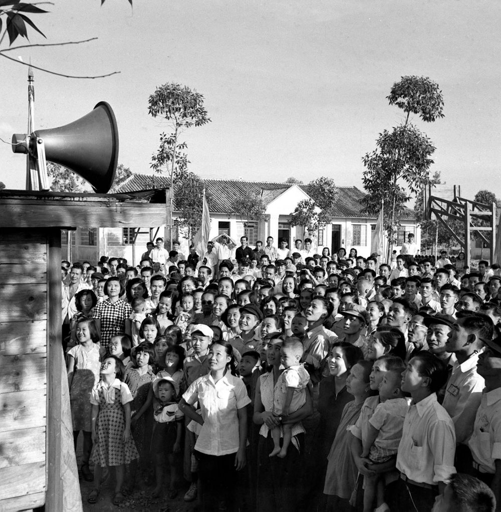 1954年9月27日,广州市石碑华侨招待所的归国华侨聆听第一届全国人民代表大会第一次会议选出国家领导人的实况广播。