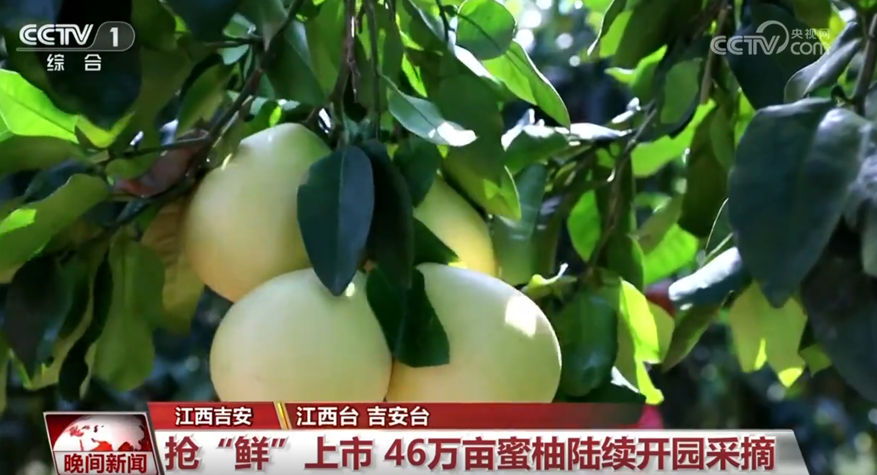 中秋节临近,江西吉安46万亩井冈蜜柚陆续开园采摘,在吉安县江南村千亩蜜柚基地里,金灿灿的柚果挂满枝头,沉甸甸的蜜柚在阳光的照射下显得格外诱人。
