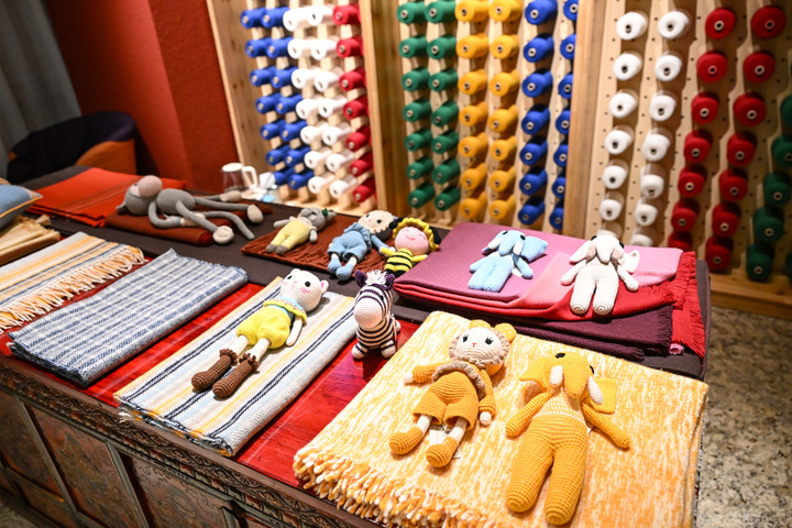 在西藏日喀则市一间门店拍摄的玩偶、围巾、披肩等江孜氆氇产品。新华社记者孙瑞博 摄
