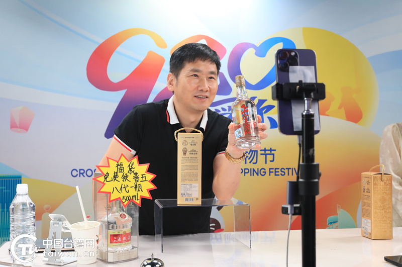 本届购物节首场直播——“尝尝酒酒”(长长久久)两岸好酒直播专场火热开播,带货达人郑云团队正在直播间介绍金门高粱酒“正金高”。(中国台湾网记者 尹赛楠 摄)