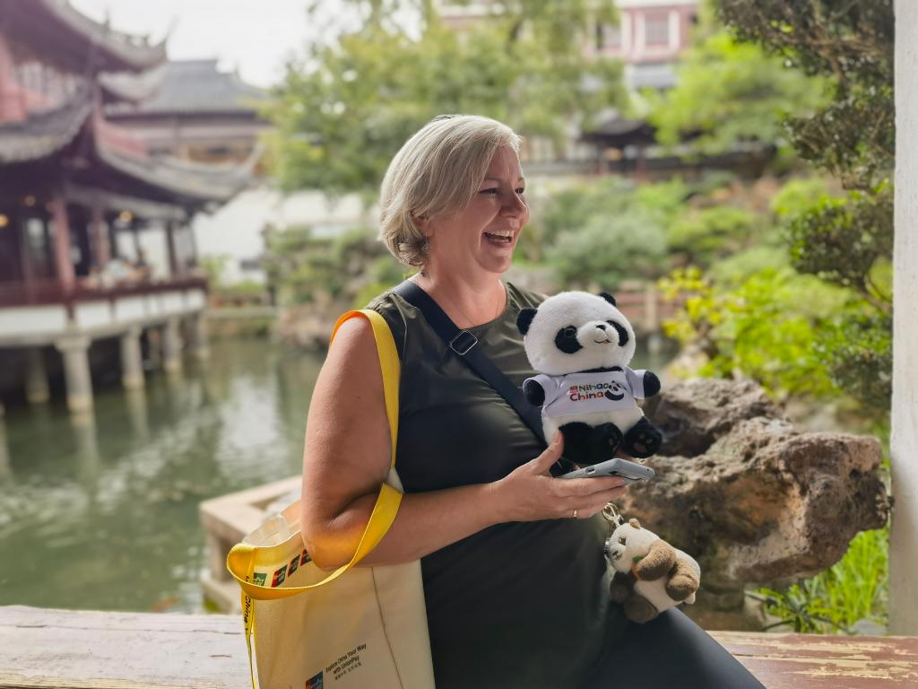 新华社上海9月22日电(记者陈爱平、赵晨捷)詹妮弗·切尔奈捧着可爱的熊猫毛绒玩具,坐在上海古典园林豫园曲折幽深的连廊上拍照。近处是亭台楼阁绿树曲水,远处有高耸如云的陆家嘴建筑——一眼望古今,这是她最喜欢上海的地方。