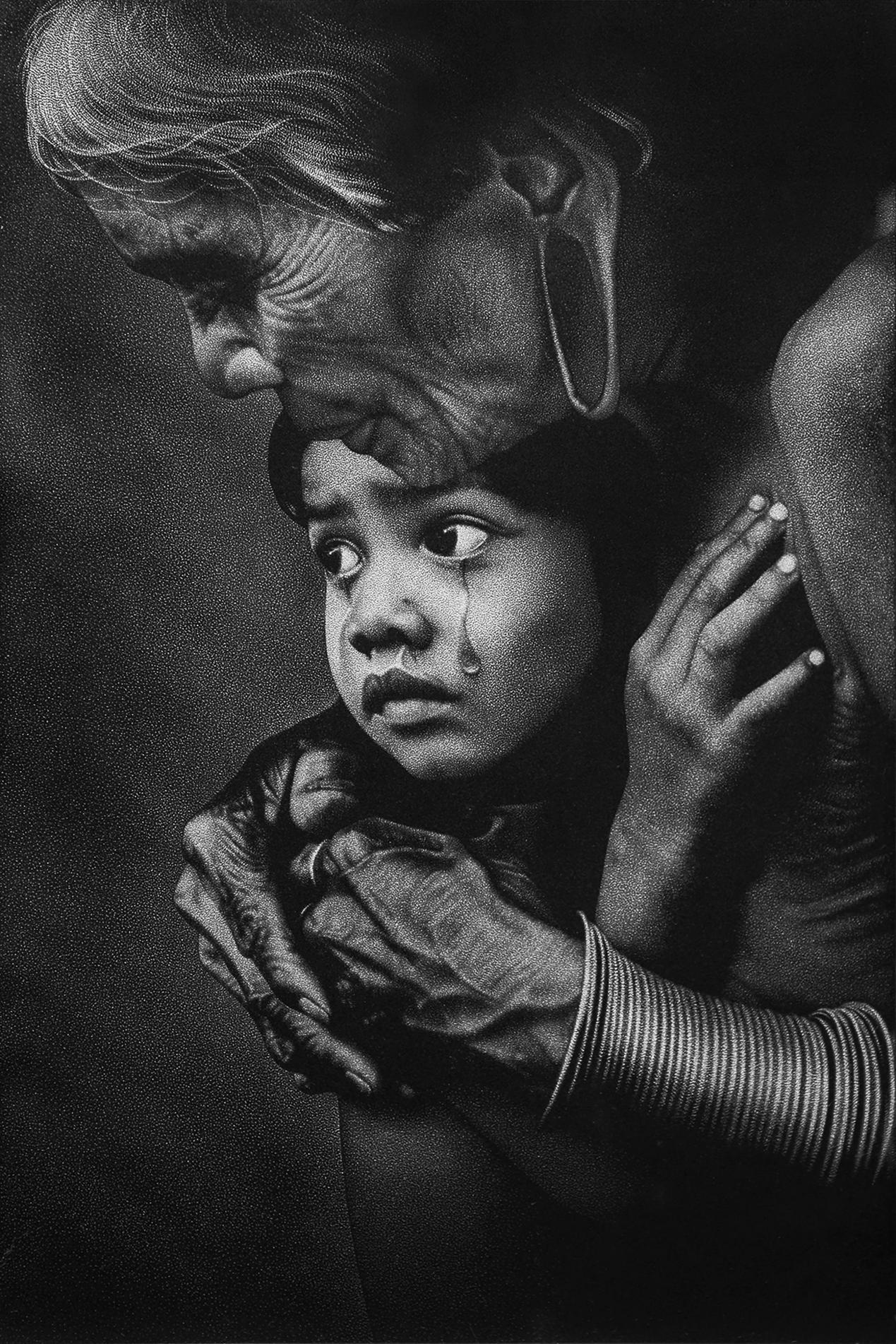 李亚华:这幅作品取材于海湾战争时的一张照片,我很悲怜这个小女孩,所以就萌生了给她做一幅作品把这幅画凝固起来的想法。这滴眼泪看起来是立体的,但其实它是平面,是在黑灰白过渡下的一个更明显的对比。因为这幅作品已经被我们国家一所在建的非遗博物馆征集收藏,所以我就想再做一幅,但是好几次都没成功,眼泪的灰度做不出来了。