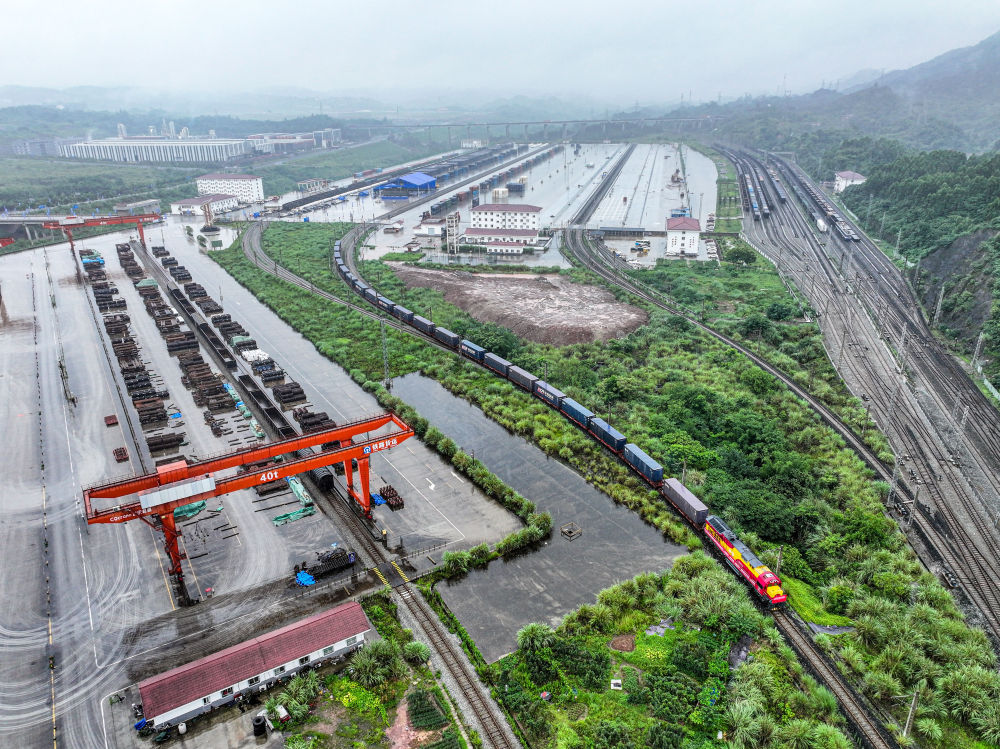 6月27日,西部陆海新通道中老泰马跨境铁路班列在重庆江津小南垭站发车(无人机照片)。新华社记者 唐奕 摄