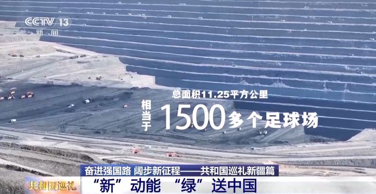 这里就是地处新疆昌吉州的南露天煤矿,这片矿区有足足11.25平方公里,相当于1500多个足球场大小。我身后300台智能矿卡正在昼夜不停工作,得益于智能化矿山建设,这座特大露天煤矿每年可以生产原煤4000万吨。
