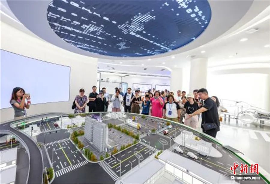 2024年7月11日,北京市高级别自动驾驶示范区创新运营中心内,工作人员通过沙盘向参观者介绍“车路云一体化”的原理和应用现状。中新社记者 贾天勇 摄
