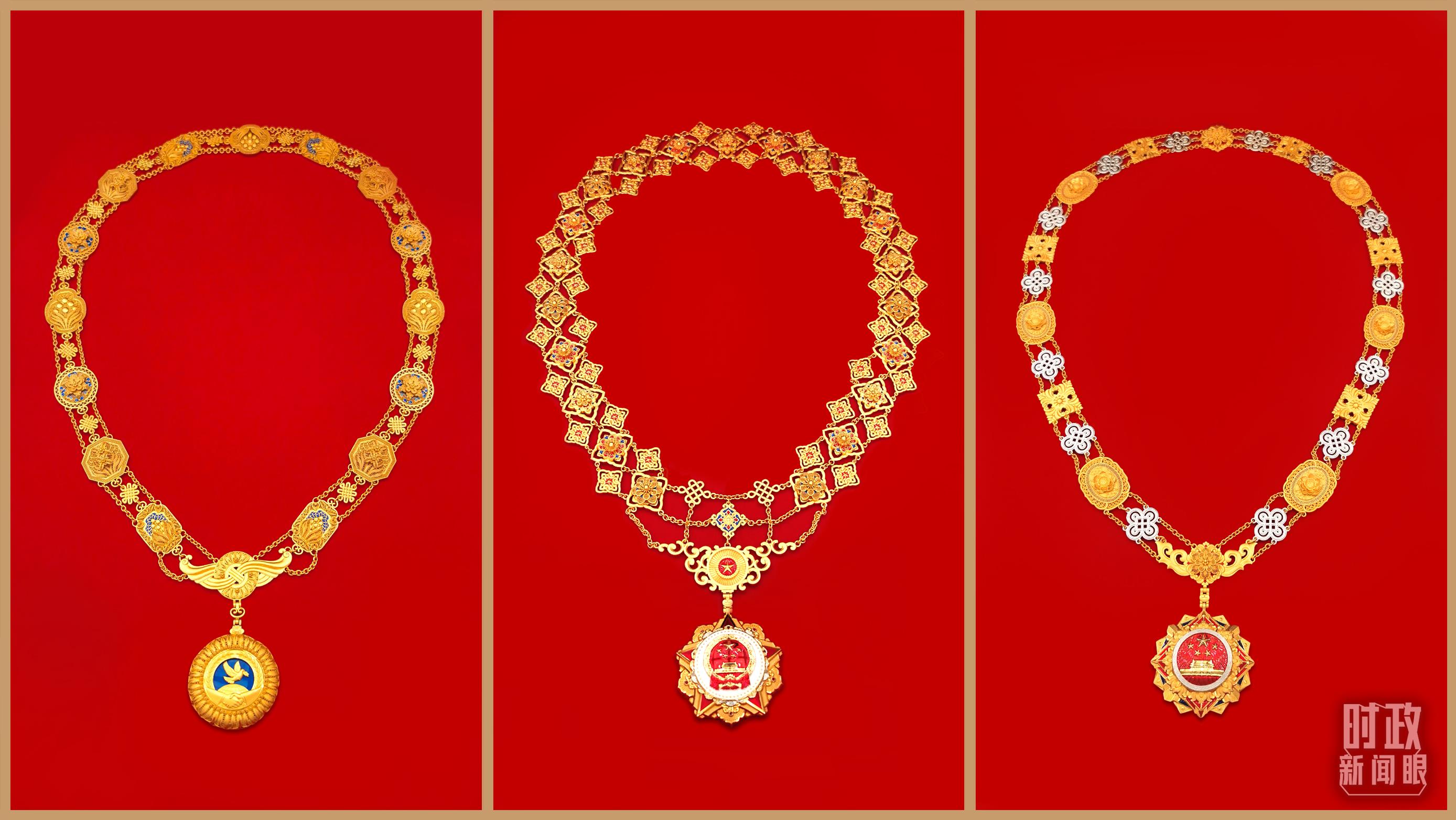 △“共和国勋章”(中)、“友谊勋章”(左)和国家荣誉称号奖章(右)。(总台央视记者郭鸿、鄂介甫拍摄)