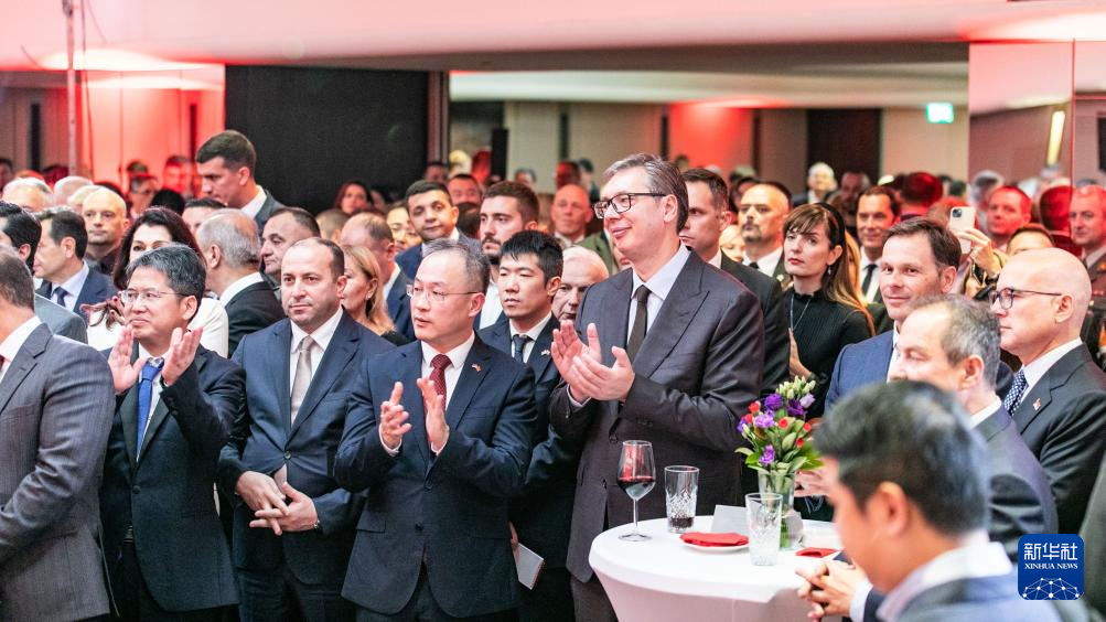 9月18日,在塞尔维亚首都贝尔格莱德,塞尔维亚总统武契奇(前中右)出席中国驻塞尔维亚大使馆国庆75周年招待会。新华社发(王韡摄)