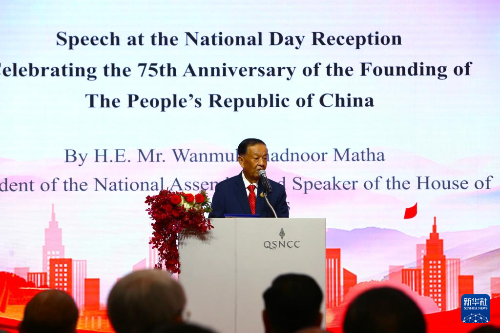 9月24日,在泰国曼谷,泰国国会主席兼下议长万·穆罕默德·努尔·玛他在中国驻泰国大使馆国庆75周年招待会上致辞。新华社记者 孙玮彤 摄