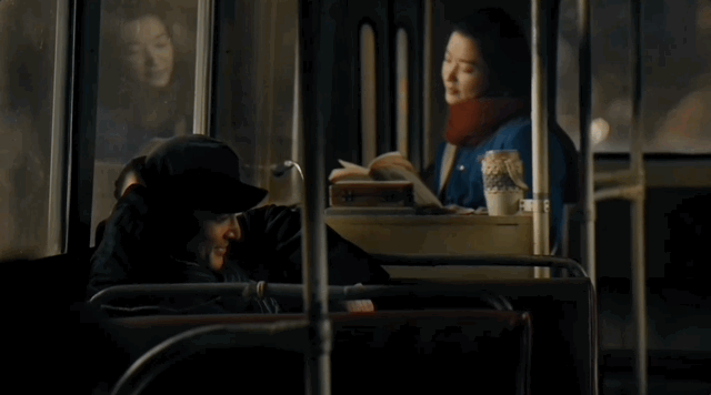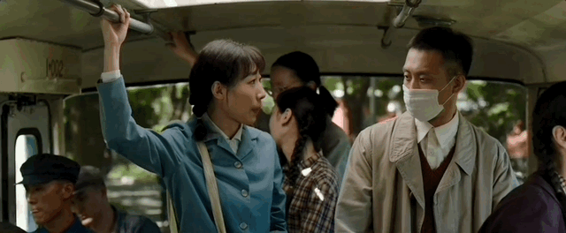 在电影《我和我的祖国》中,隐姓埋名的科研工作者和恋人在公交车上偶遇。