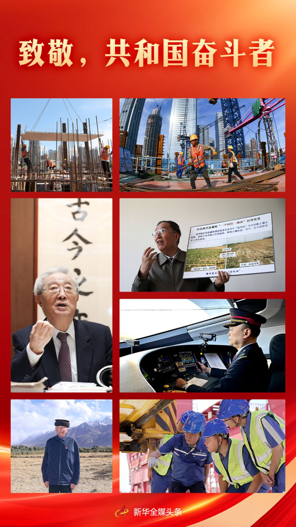 田间地头、工厂车间、科研一线,在党的领导下,共和国的奋斗者们勠力同心、开拓进取。他们的身影,定格成最美丽的风景,汇聚起全面建设社会主义现代化国家新征程上的磅礴力量。