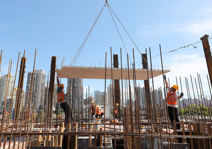 10月3日,中建二局的建设者在位于上海市中心的一处建筑工地施工。新华社记者 方喆 摄