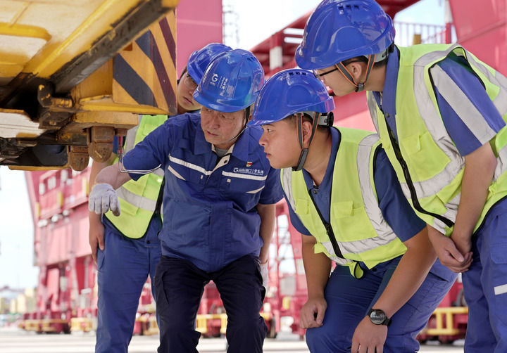 许振超(左二)和团队成员在山东港口青岛港集装箱码头研究传统集装箱桥吊的智能化升级方案(2024年9月2日摄)。新华社发(闫军 摄)