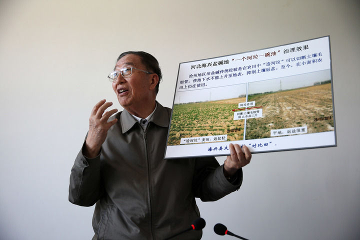 李振声院士在介绍河北海兴盐碱地治理的前后对比照片(2014年5月5日摄)。新华社记者 金立旺 摄