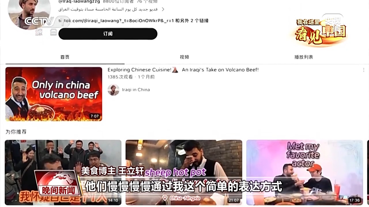 美食博主 王立轩:我们把老王每天拍的视频就放到国外的网站,叫“伊拉克人在中国”。他们慢慢通过我这个简单的表达方式,让他们也能看到美好的中国、真实的中国、和平的中国。