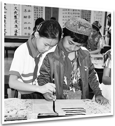 图③:喀什地区青少年交流活动中,汉族儿童和维吾尔族儿童同写书法。喀什地委宣传部供图