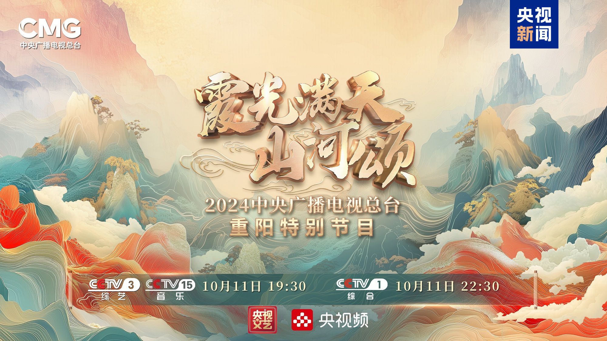 《霞光满天山河颂——2024中央广播电视总台重阳特别节目》将在10月11日19:30档,在总台央视综艺频道(CCTV-3)、音乐频道(CCTV-15)并机播出,22:30档综合频道(CCTV-1)重播,央视频、央视网等新媒体平台同步播出。让我们在重阳节里,一起感受山海深情、岁月华章。