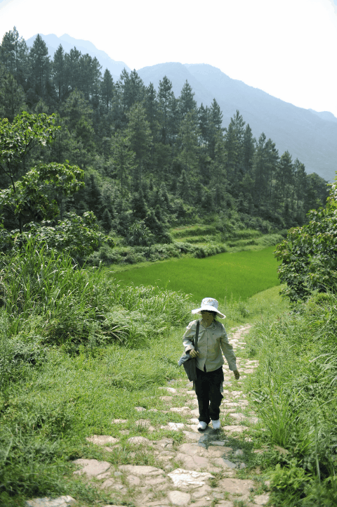 2011年7月步行送邮件的罗细英与2024年9月重走乡邮路的罗细英。如今的乡邮路已长满杂草。