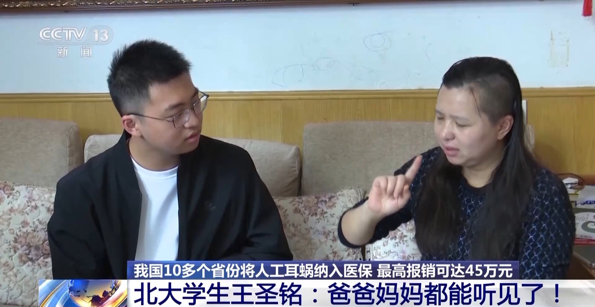 以前,人工耳蜗植入主要针对孩子,现在有了医保报销,一些耳聋的成年人也有条件植入人工耳蜗了。今年7月考上北京大学临床医学院的王圣铭一直有一个愿望,就是给耳聋的父母装上人工耳蜗,让他们听得见他叫一声“爸爸、妈妈”。在医保和公益基金的支持下,王圣铭的父母,在失聪40多年之后成功植入了人工耳蜗。