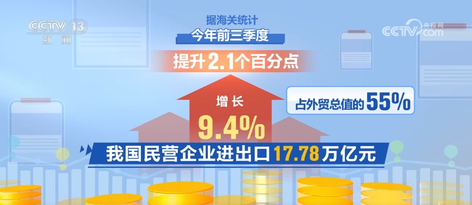 据海关统计,今年前三季度,我国民营企业进出口17.78万亿元,增长9.4%,占外贸总值的55%,提升2.1个百分点;外商投资企业进出口9.53万亿元,增长1.1%,连续两个季度增长;国有企业进出口4.95万亿元,增长0.1%。