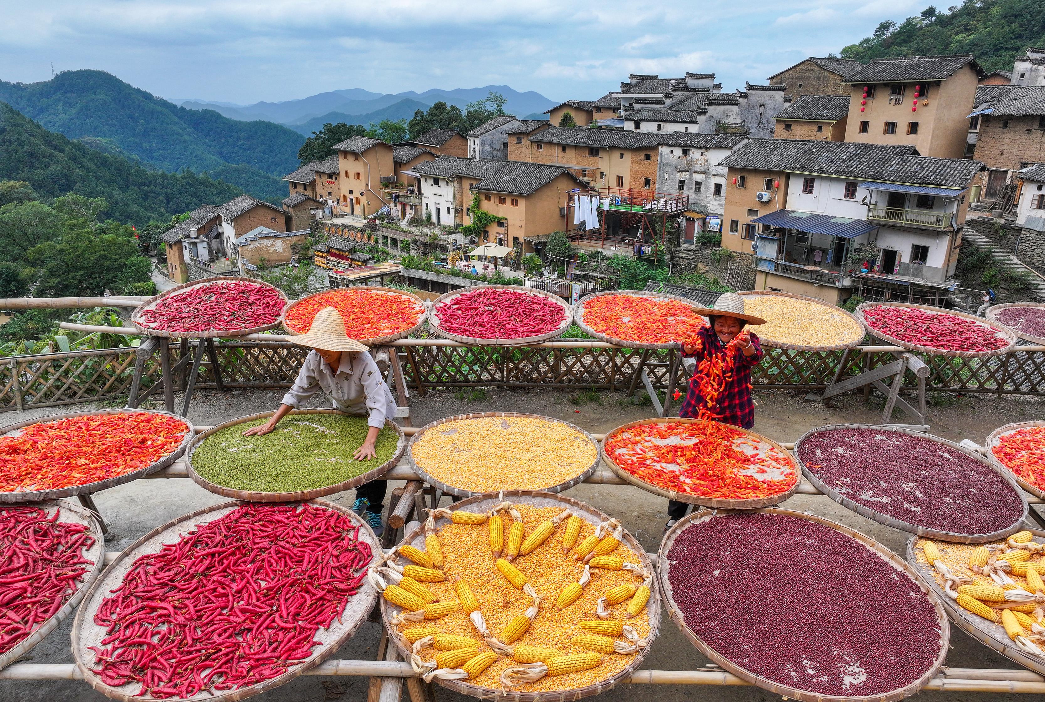 △2024年9月22日,安徽省黄山市歙县阳产村,村民正在土楼前晾晒农作物。