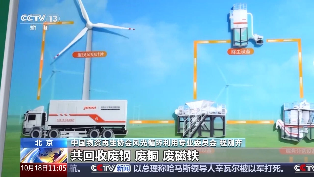 中国物资再生协会风光循环利用专业委员会 程刚齐:今年前三个季度全国共完成了396台风机回收处置交割工作。共回收废钢、废铜、废磁铁、废复合材在内的近5万吨资源。风电设备循环利用让绿色能源发展更绿色。