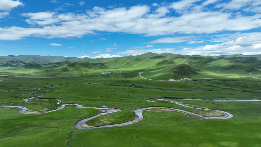 这是甘肃省甘南藏族自治州玛曲县阿万仓湿地景色(2023年7月6日摄,无人机照片)。新华社记者 陈斌 摄