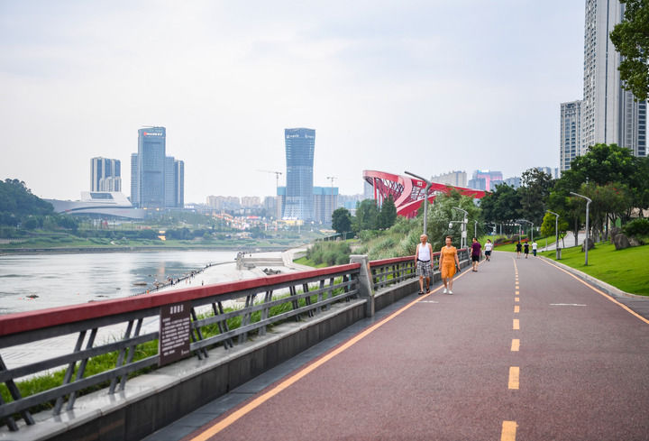 人们在四川省宜宾市三江口长江边的绿道上散步(2023年6月28日摄)。新华社记者 王曦 摄