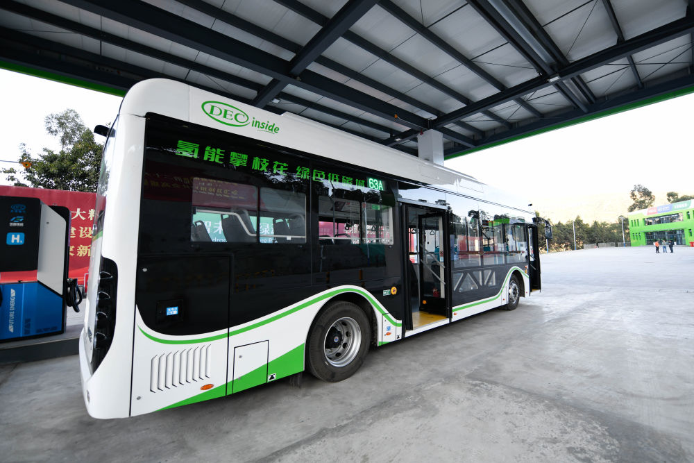 停靠在四川攀枝花加氢站的氢能公交车(2022年11月27日摄)。新华社记者 胥冰洁 摄