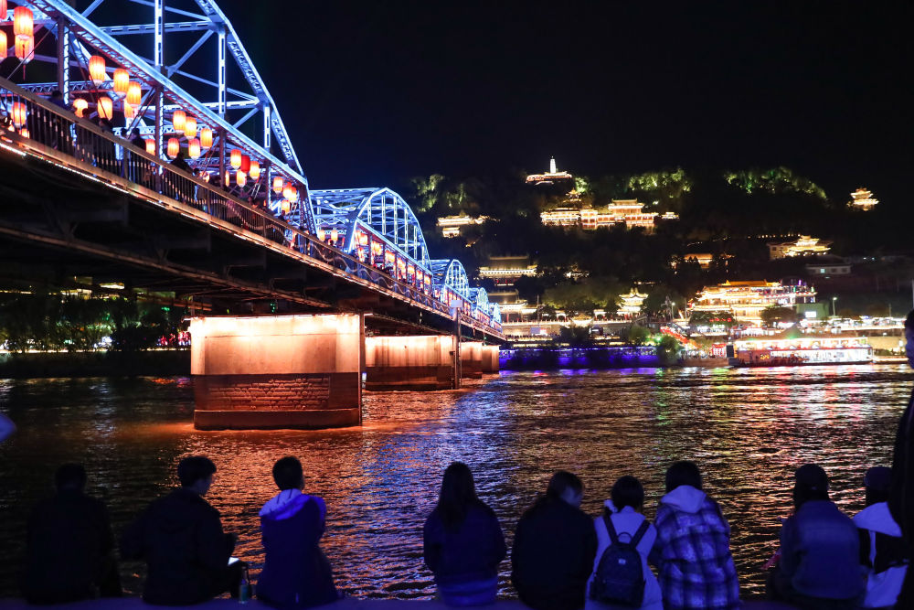 2024年10月4日晚,游客在黄河兰州段岸边欣赏黄河夜景。新华社记者 郎兵兵 摄