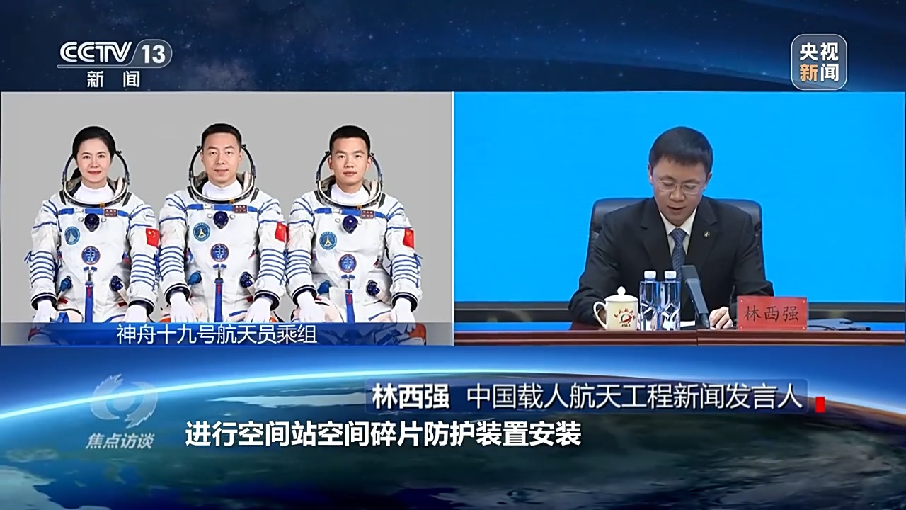 中国载人航天工程新闻发言人 林西强:此次任务在空间站驻留约六个月,开展空间科学与应用实(试)验,实施航天员出舱活动及货物进出舱,进行空间站空间碎片防护装置安装,舱外载荷和舱外设备安装与回收等任务,开展科普教育和公益活动以及空间搭载试验。